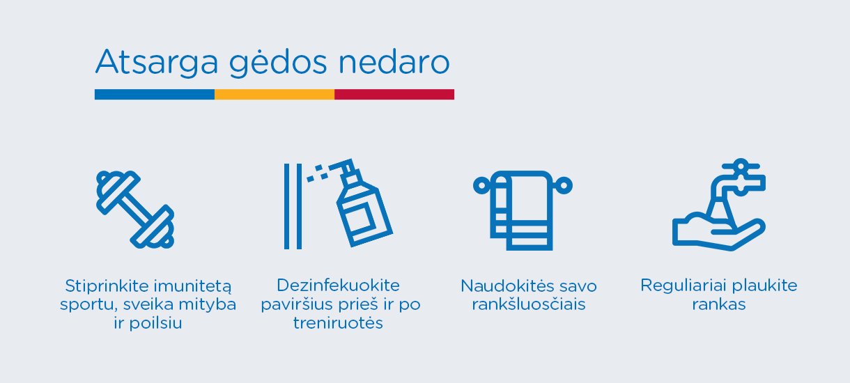 - Sportuojant dezinfekuoti paviršius prieš ir po treniruotės.