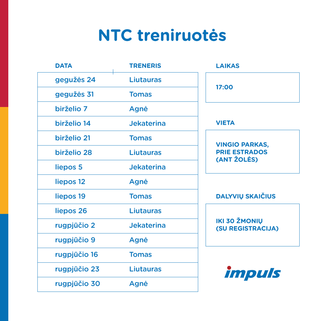 NTC treniruočių programa sukurta NIKE fitneso ekspertų funkcinių treniruočių pagrindu. Ji ne tik siūlo efektyvius ir veiksmingus pratimus, bet yra smagi ir lengvai pritaikoma įvairaus fizinio pasirengimo žmonėms, todėl puikiai tiks naujam jūsų startui. Jau nuo gegužės 24 d., kiekvieną vasaros sekmadienį, 17.00 val. prie Vingio parko estrados jūsų lauks IMPULS treneriai.