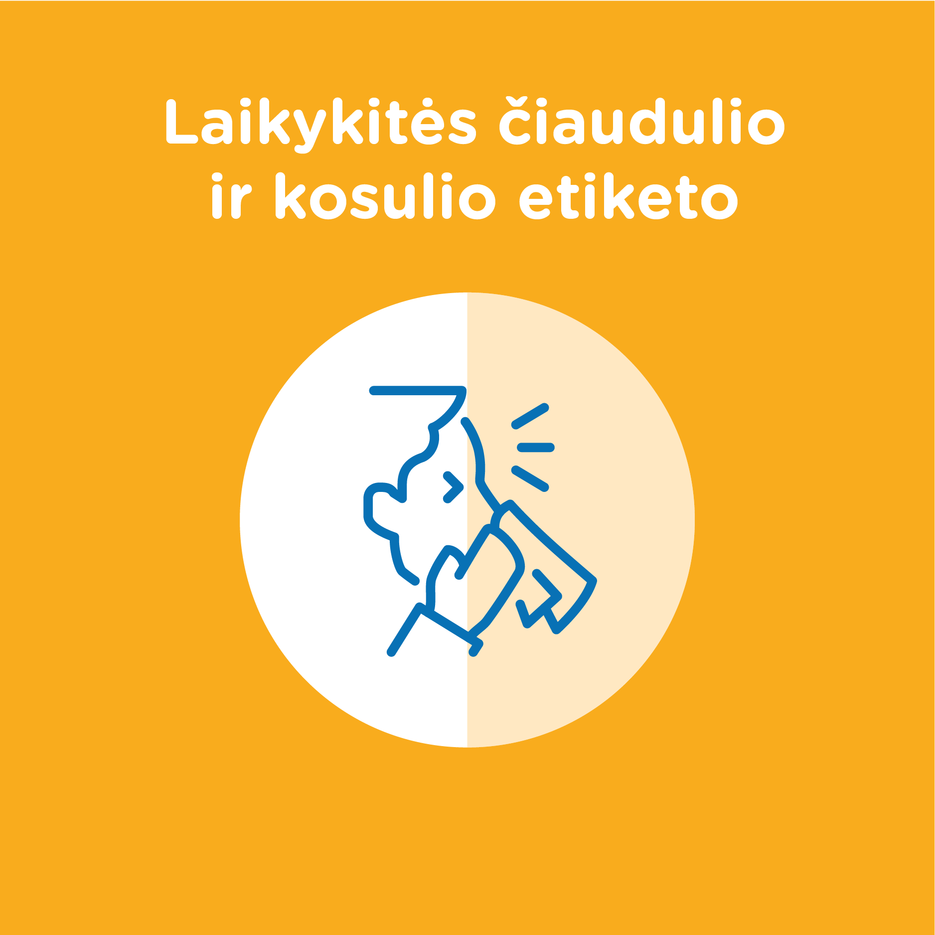 – Kosėdami ar čiaudėdami užsidenkite burną ir nosį servetėle. Jei jos neturite, burną prisidenkite sulenkta ranka ties vidine alkūnės puse.