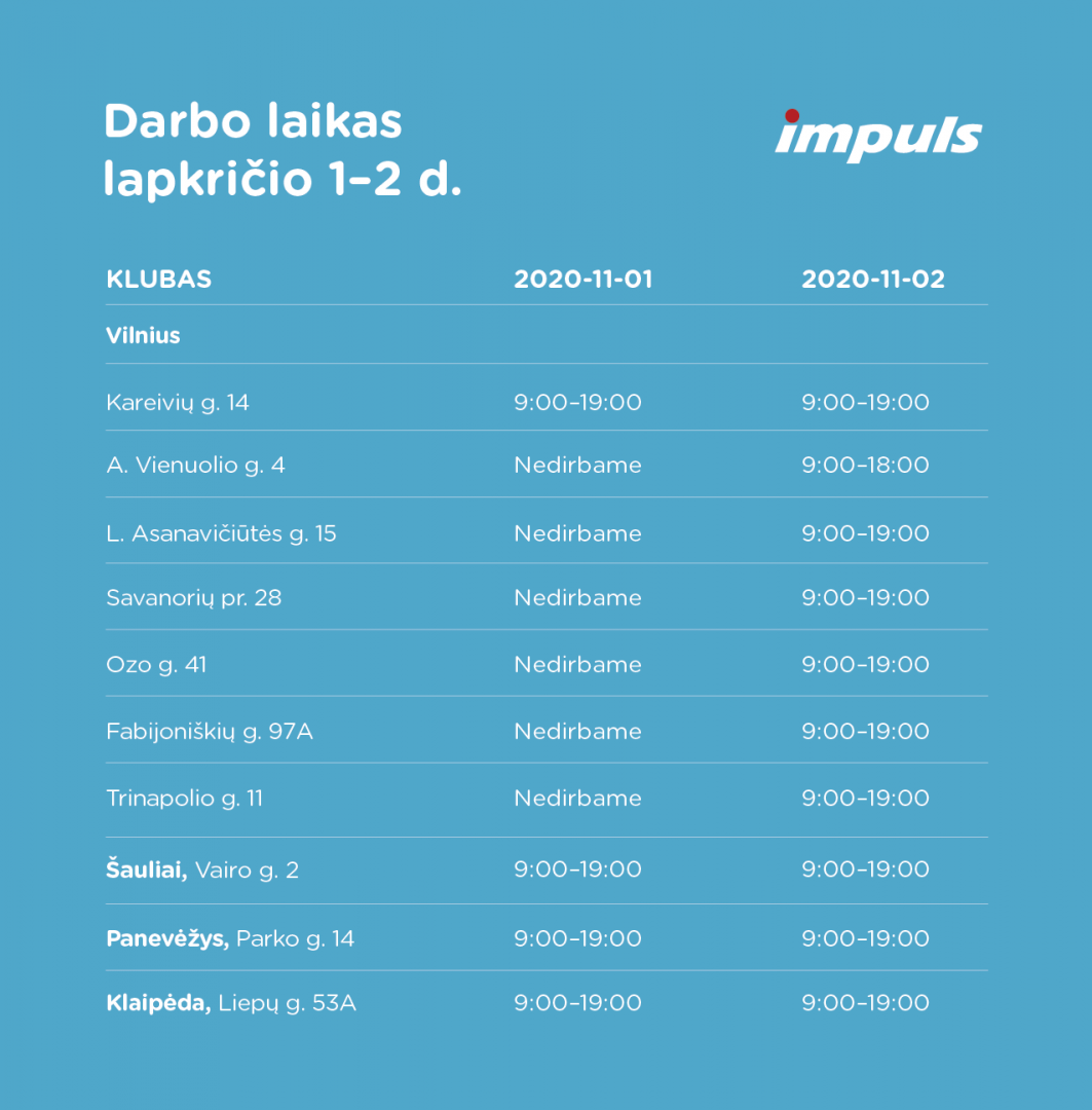 Pirmasis lapkričio savaitgalis – ilgasis, tačiau ir planų sąrašas ilgas. Keliausite uždegti žvakę giminaičiams, dar į Helovino vakarėlį norite užsukti, o gal dar ir pasportuoti? Visur spėti lengviau, kai viską suplanuojame iš anksto. Todėl jau dabar dalinamės IMPULS darbo laiku lapkričio 1–2 d.