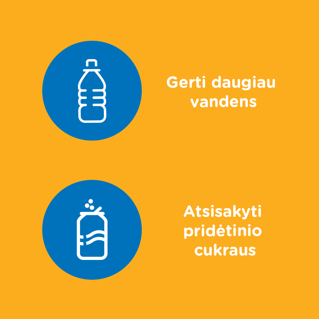 Pridėtinio cukraus reiktų vengti visiems. Jis neturi jokios maistinės vertės, bet padidina suvartotų kalorijų kiekį ir skatina svorio augimą. Gausesnis vandens vartojimas, priešingai, suteikia energijos, slopina alkį, pagreitina medžiagų apykaitą ir suteikia odai elastingumo. Pasak specialistų, vidutiniškai per dieną žmogus turėtų išgerti 2 litrus, t. y. 8 stiklines, vandens (kava, arbata ar kiti gėrimai neturėtų būti įskaičiuojami į šį kiekį).