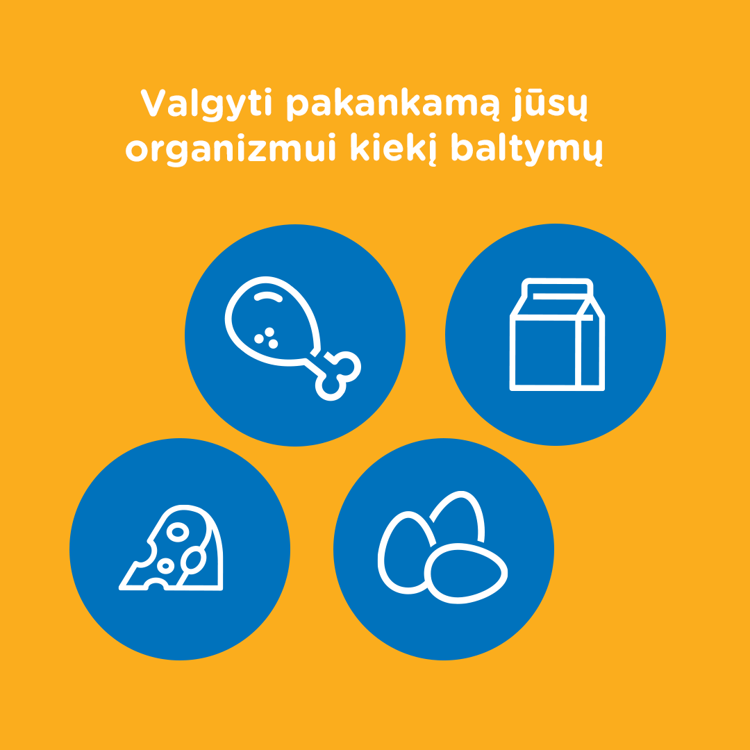 Fiziškai aktyviems asmenims rekomenduojama per dieną suvartoti 1,5-2 gramus baltymo vienam kūno kilogramui (pavyzdžiui, 60 kg sverianti moteris turėtų suvartoti nuo 90 iki 120 gramų gryno baltymo per dieną). Rekomenduojame aktyviai sportuojant saugoti savo raumeninę masę ir valgyti pakankamą jūsų organizmui kiekį baltymų.