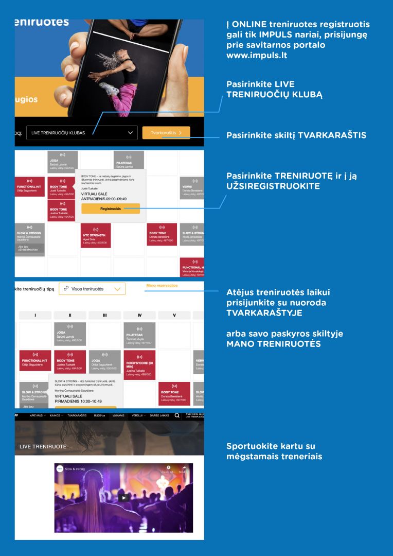 Į ONLINE treniruotes registruotis gali IMPULS nariai, prisijungę prie savitarnos portalo www.impuls.lt