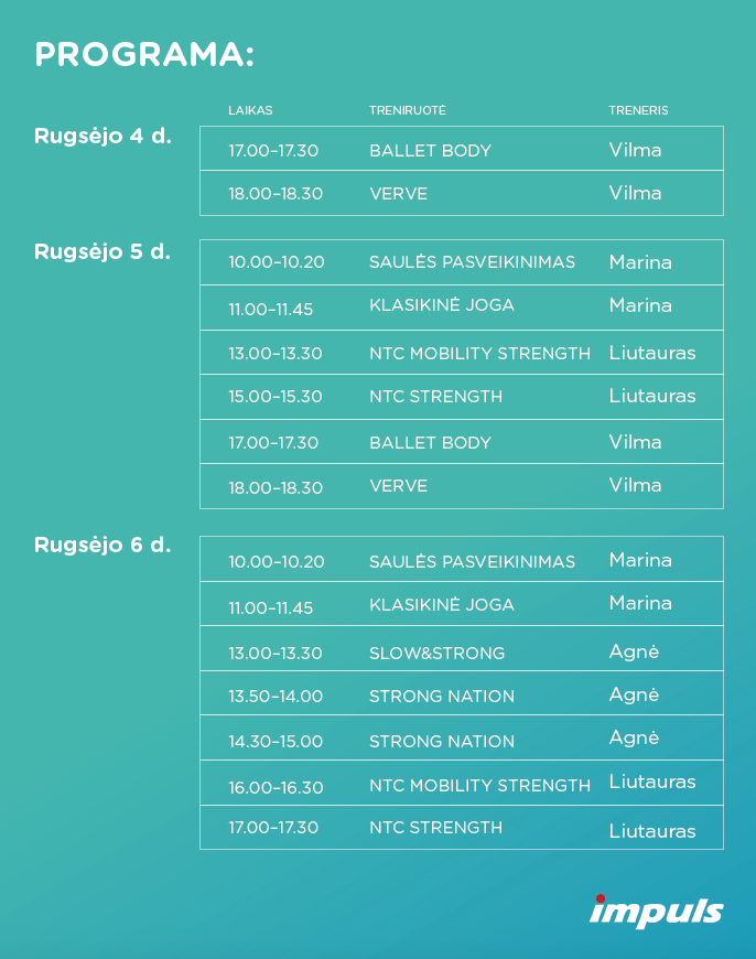 IMPULS treneriai kviečia į išskirtines treniruotes – beveik visoms paruošėme specialias ausines. Elgiamės atsakingai – visa įranga bus kruopščiai dezinfekuojama, taip užtikrinant maksimalų dalyvių saugumą. Dalinamės programa ir kviečiame ateiti laiku, nes ausinių skaičius ribotas.