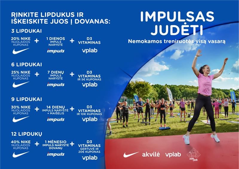 30% NIKE NUOLAIDOS KUPONAS + 14 DIENOS IMPULS NARYSTĖ + Riboto leidimo IMPULS maišelis + VPLab D3 Vitaminas ir 10 eur. KUPONAS